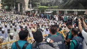 স্বতন্ত্র ইবতেদায়ী মাদরাসার জাতীয়করণ দাবিতে অবস্থান ধর্মঘট প্রেসক্লাবের সামনে সড়কে নামাজ আদায়, যানজট সৃষ্টি