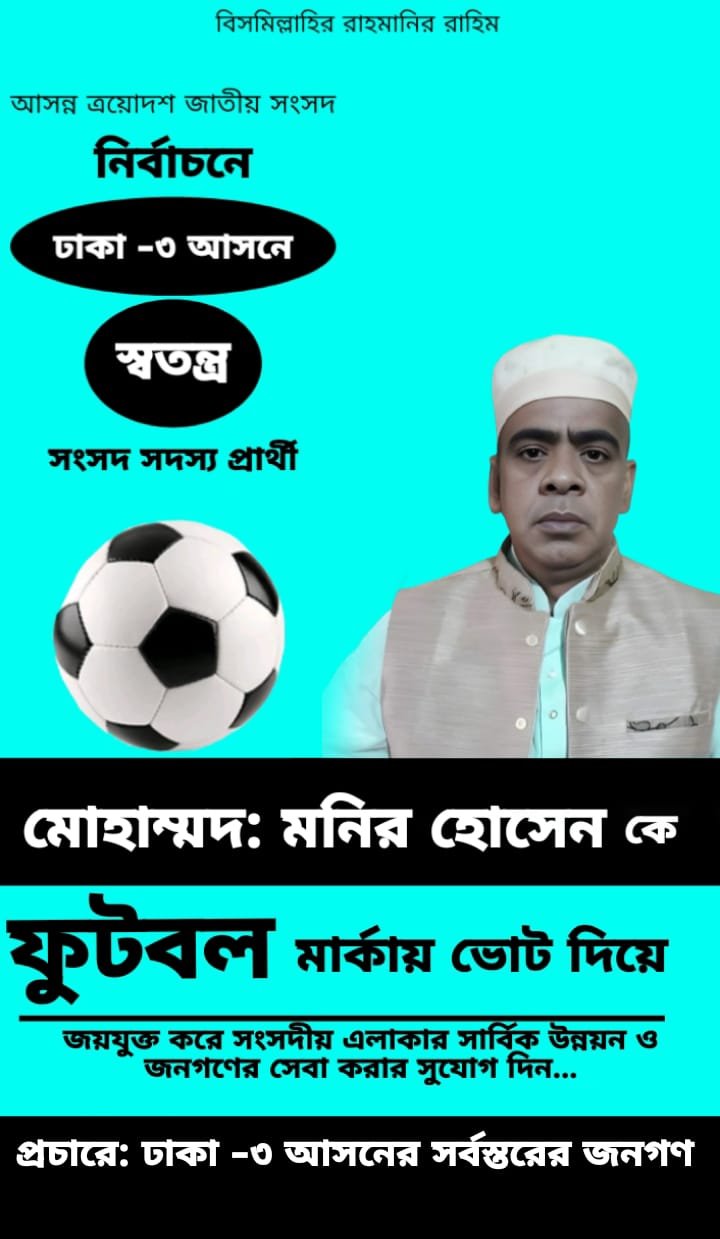 ঢাকা-৩ আসনে ফুটবল প্রতীকে স্বতন্ত্র প্রার্থী হিসেবে নির্বাচন করছেন : মনির হোসেন