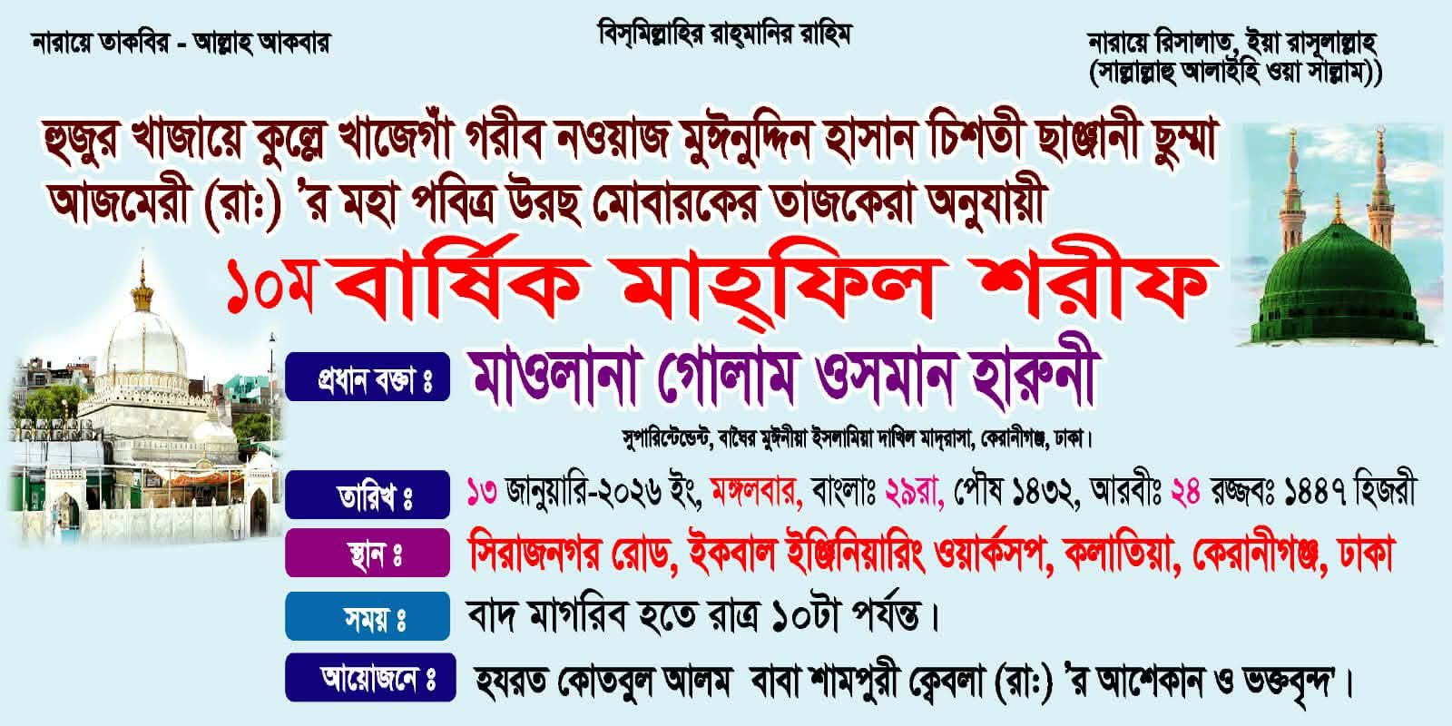 খাজায়ে কুল্লে খাজেগাঁ গরীব নওয়াজ (রাঃ) এর উরছ উপলক্ষে কেরানীগঞ্জে ১০ম বার্ষিক মাহফিল শরীফ অনুষ্ঠিত