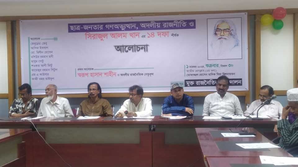 ছাত্র-জনতার গণঅভ্যুত্থান,অদলীয় রাজনীতি ও সিরাজুল আলম খানের ১৪ দফা শীর্ষক আলোচনা সভা অনুষ্ঠিত হয়েছে।আজ শুক্রবার জাতীয় প্রেস ক্লাবের তফাজ্জল হোসেন