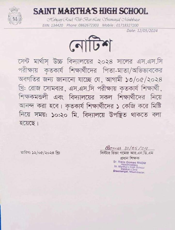 এসএসসি পাস করা শিক্ষার্থীদের এক কেজি মিষ্টি আনতে স্কুলের নোটিশমৌলভীবাজারের শ্রীমঙ্গলের সেন্ট মার্থাস উচ্চ বিদ্যালয় থেকে এসএসসি পাস করা শিক্ষার্থীদের