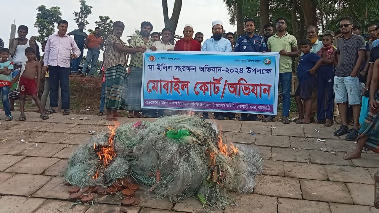 সরকারি নিষেধাজ্ঞা চলাকালীন মা ইলিশ শিকারের অপরাধে রাজবাড়ীতে ভ্রাম্যমাণ আদালত পরিচালনা করে ৩ জেলেকে কারাদণ্ড দেওয়া হয়েছে। এসময় ৬৩ হাজার