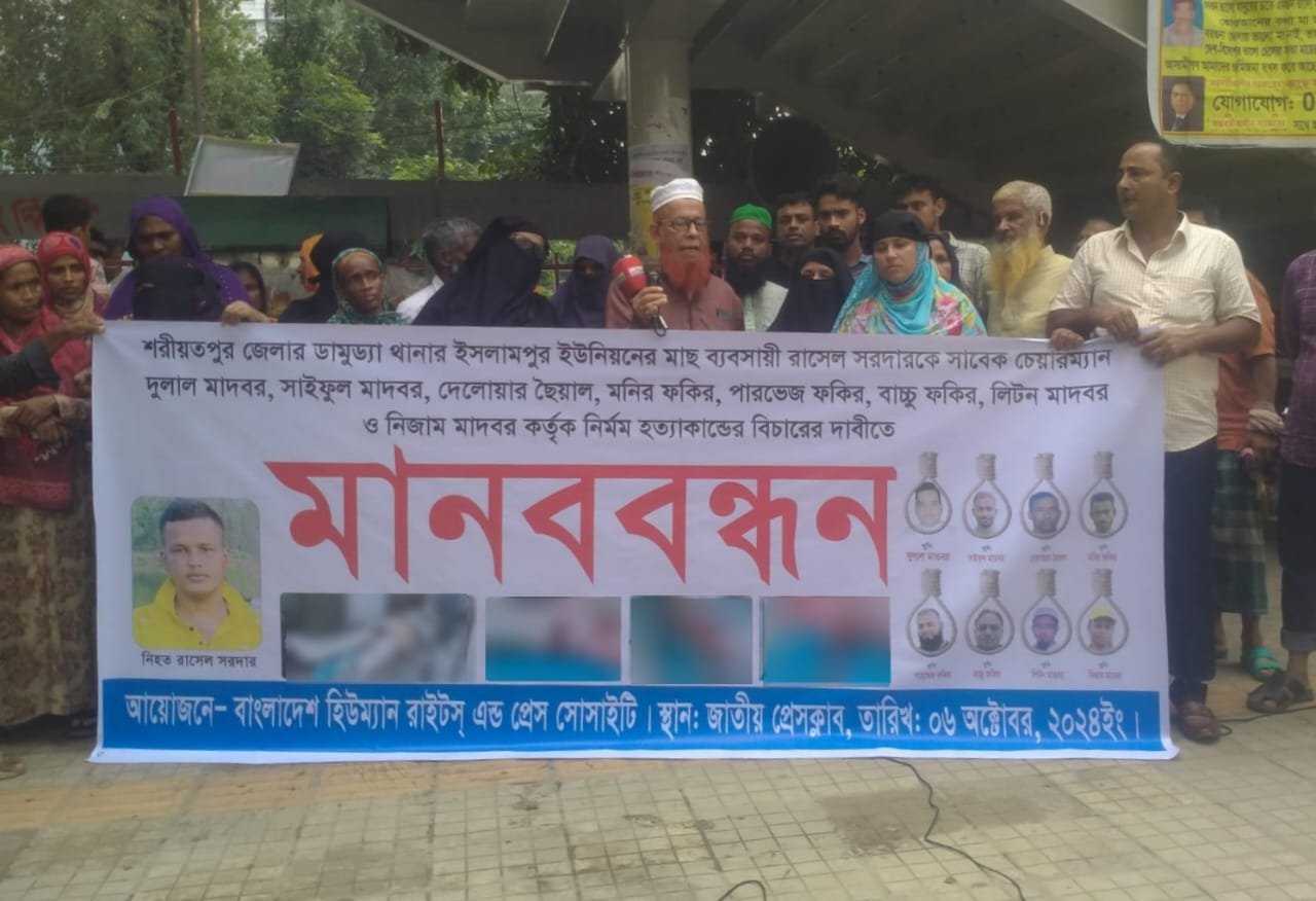 জাতীয় প্রেসক্লাবের সামনে মানবাধিকার সংস্থা বাংলাদেশ হিউম্যান রাইটস্ এন্ড প্রেস সোসাইটি কর্তৃক জনস্বার্থে আয়োজিত শরীয়তপুর জেলার ডামুড্যা থানার ইসলামপুর ইউনিয়নের