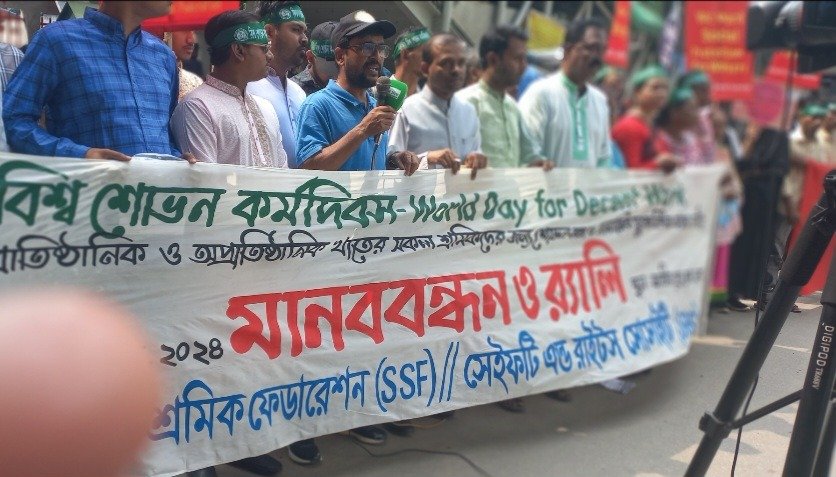 সকল শ্রমিকের জন্য শোভন কাজ ও সামাজিক ন্যায়বিচারের দাবীতে “বিশ্ব শোভন কর্মদিবস-২০২৪” উপলক্ষে জাতীয় প্রেসক্লাবের সামনে মানব বন্ধন ও র্যালিঢাকা,