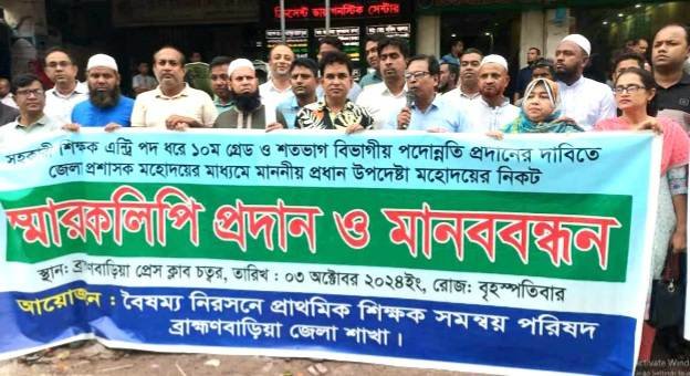 ব্রাহ্মণবাড়িয়ায় সরকারি প্রাথমিক বিদ্যালয়ের সহকারী শিক্ষকদের ১০ম গ্রেড বাস্তবায়নের দাবিতে মানববন্ধন ও স্মারকলিপি প্রদানের কর্মসূচি পালিত হয়েছে। বৃহস্পতিবার (৩ অক্টোবর)