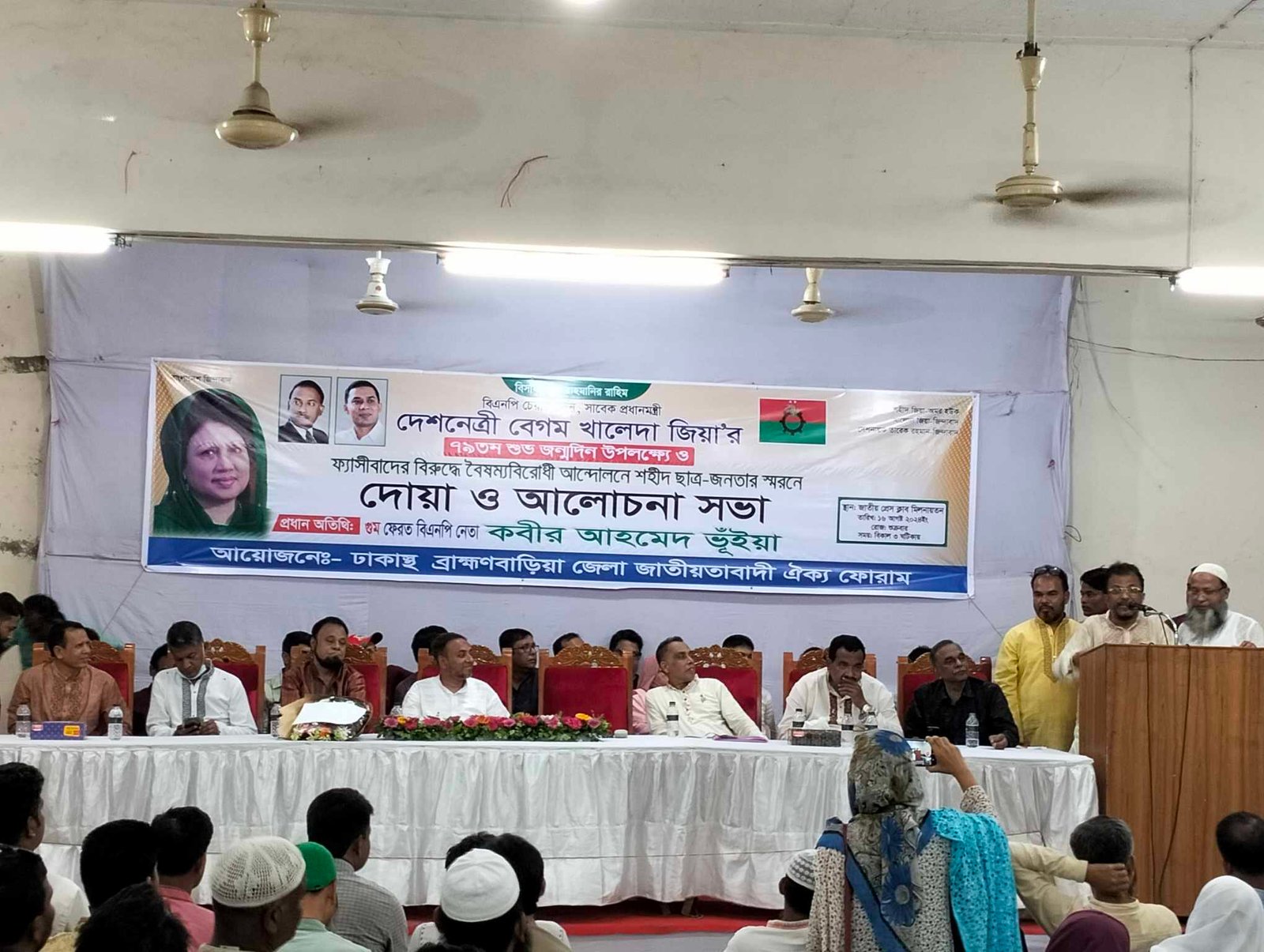 জাতীয় প্রেস ক্লাব মিলনায়তনে ঢাকাস্থ ব্রাহ্মণবাড়ীয়া জেলা জাতীয়তাবাদী ঐক্য ফোরামের আয়োজনে দোয়া ও আলোচনা সভার আয়োজন করা হয়।শুক্রবার (১৬ আগষ্ট)