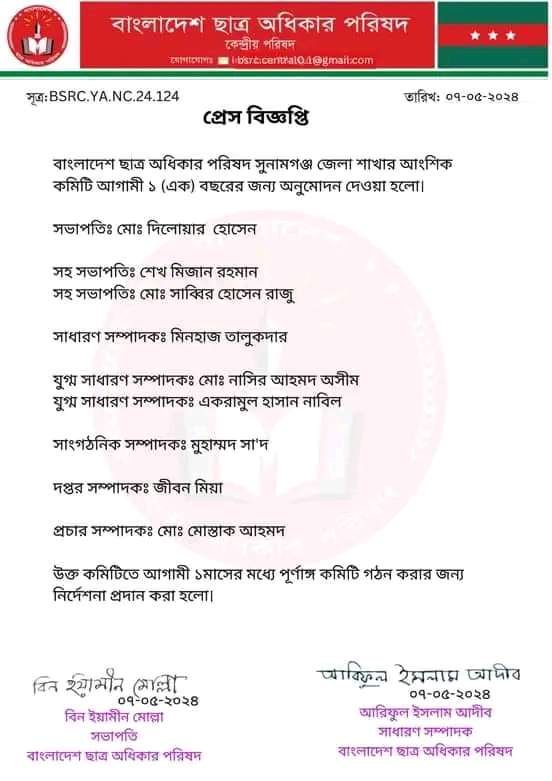 সুনামগঞ্জ জেলা শাখার কমিটি আগামী ১ বছর এর জন্য অনুমোদন দিয়ে প্রেস বিজ্ঞপ্তি