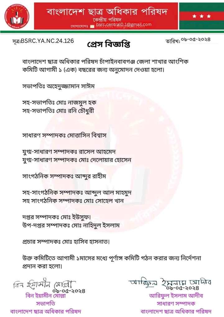 চাঁপাইনবাবগঞ্জ জেলা শাখার কমিটি আগামী ১ বছর এর জন্য অনুমোদন দিয়ে প্রেস বিজ্ঞপ্তি
